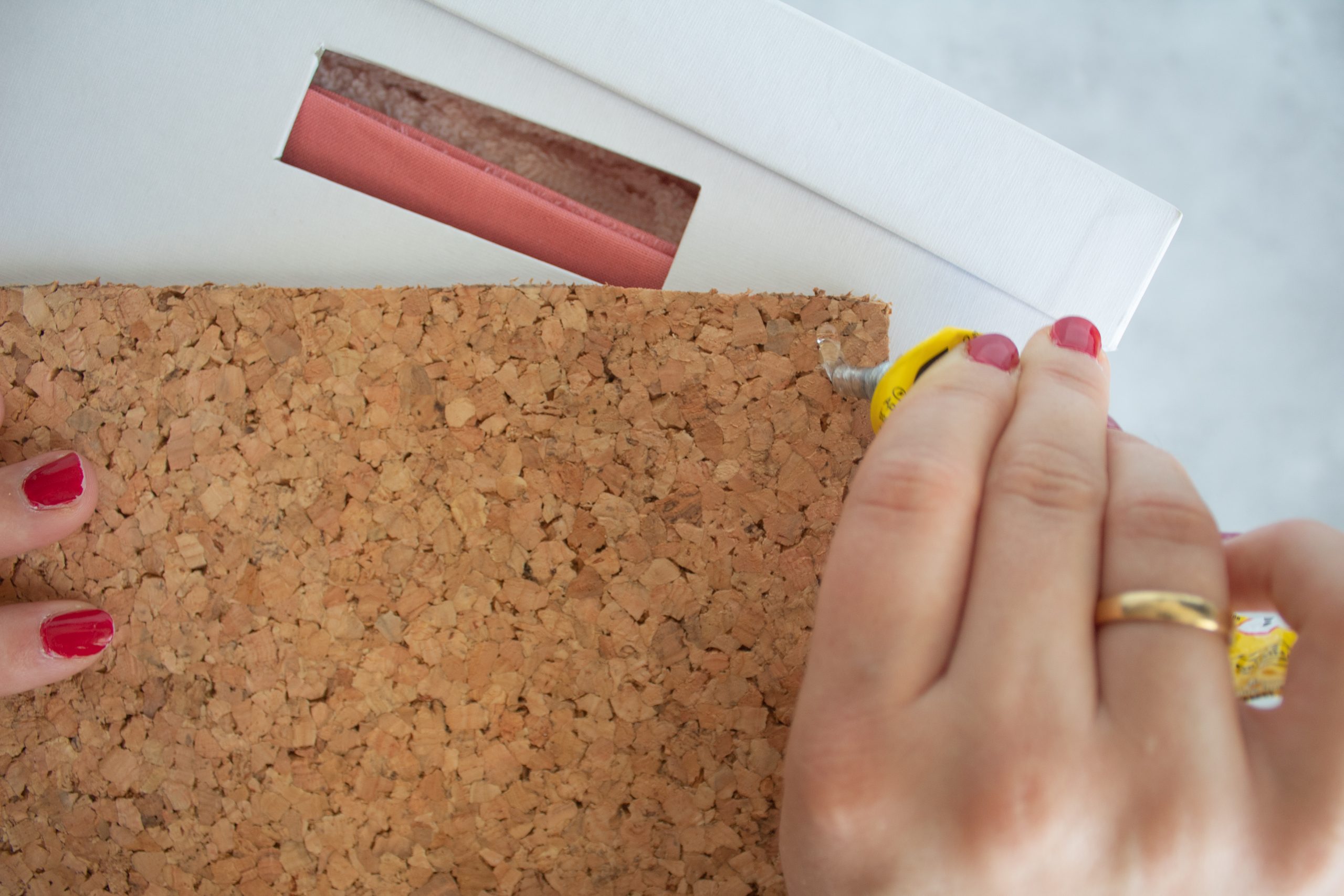- Drücke die Fläche gut fest. Ich habe die Ordnungsbox mit der Korkfläche nach unten auf den Boden gelegt und etwas Schweres in die Box gelegt.
