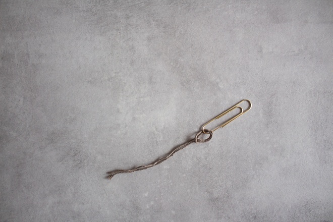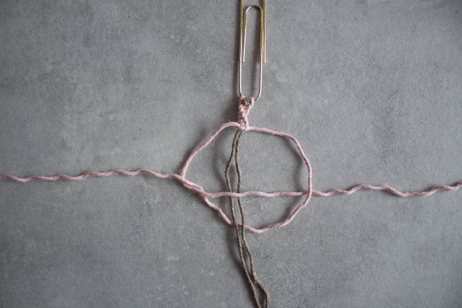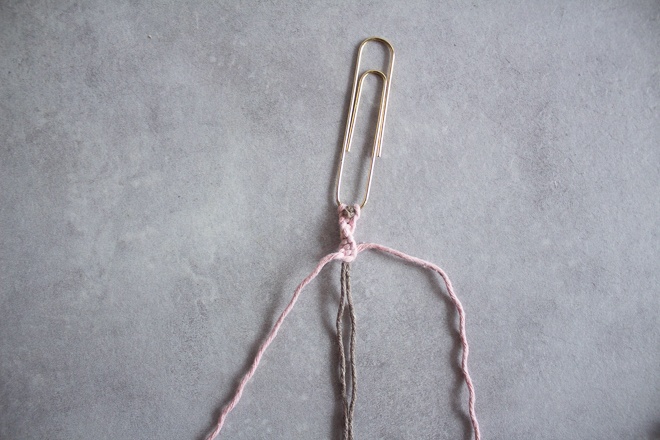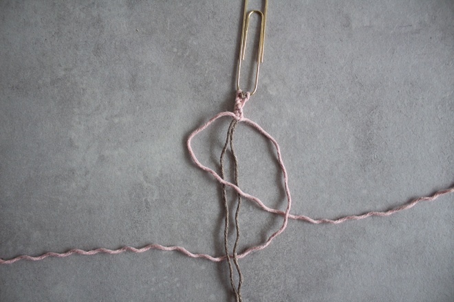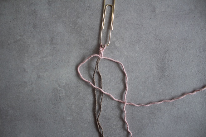 - Die Knüpffäden sollten circa 3-mal so lang sein wie die Leitfäden. Auch hier nimmst du den Faden wieder doppelt so lang und knotest ihn ebenfalls um die Büroklammer.