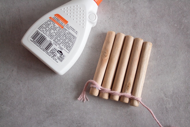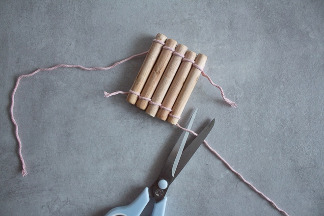 - Wickel das Garn um jedes Hölzchen, sodass alle miteinander fixiert sind. Knote das Garn am letzten Holz fest.