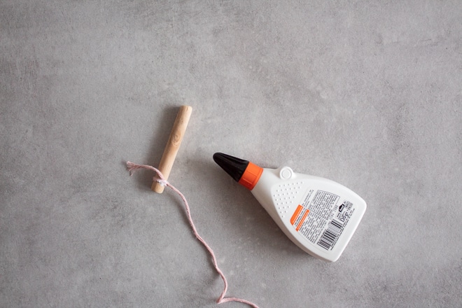 - Knote den ersten Faden an das erste Hölzchen und fixiere es mit Leim.