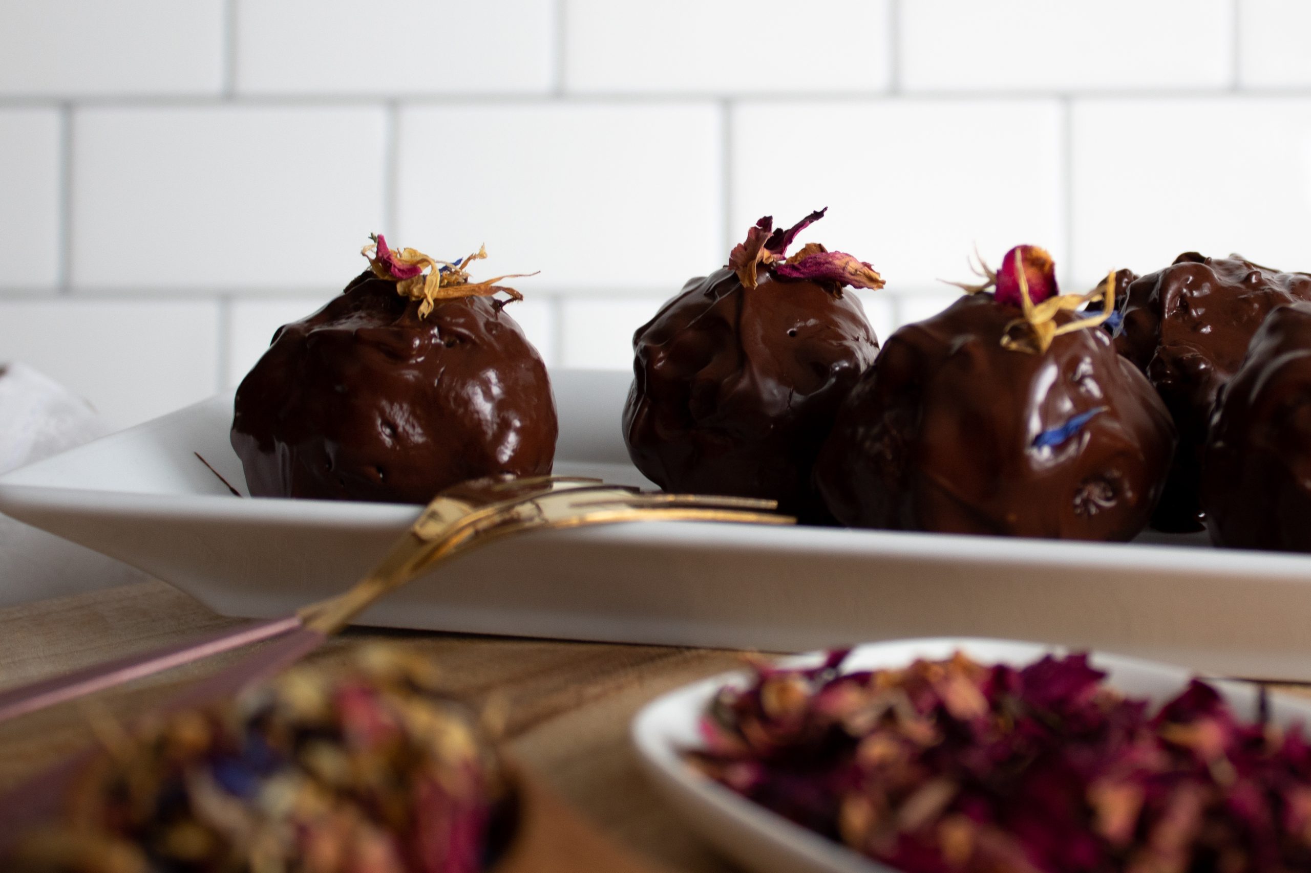 Dekorieren kannst du die Kuchenpralinen wie du willst. Ich habe mich für getrocknete Blüten entschieden. Diese wirken immer edler als klassische Zuckerstreudeko. Zur Kirsch-Saison kannst du auch eine frische Kirsche obendrauf setzen.
