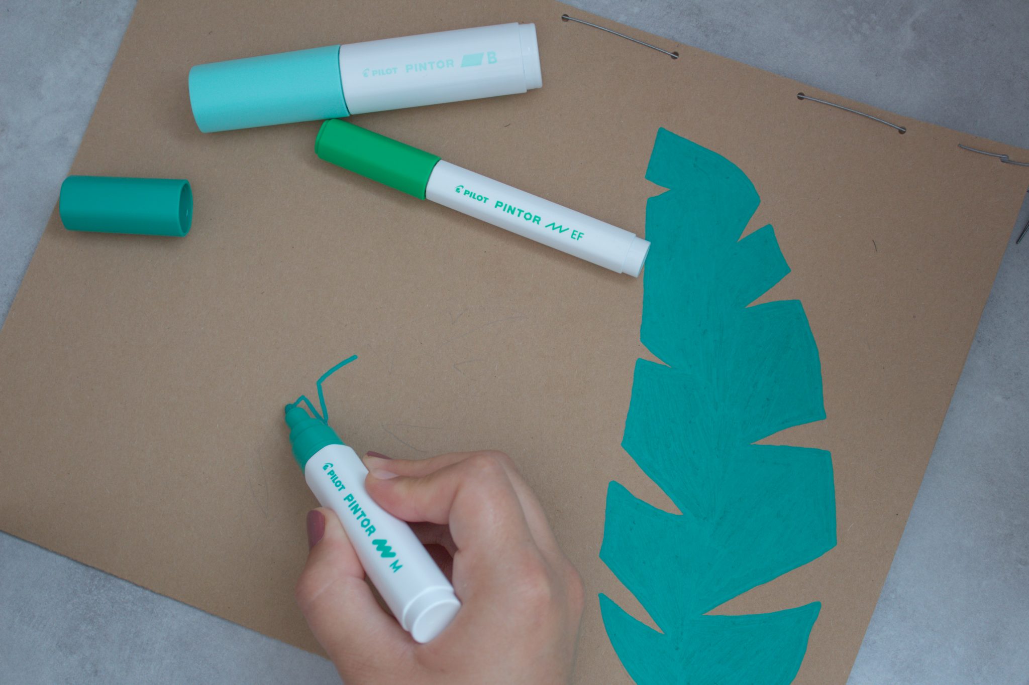 Ich bin kein Fan von den klassischen, langweiligen Hängeregister-Boxen. Die sind mir irgendwie zu langweilig und schreien so nach Behörde. Wenn du aber schon so eine Box zu Hause hast, behalte sie und gestalte sie einfach individuell und neu, indem du sie mit den PINTOR Kreativmarkern gestaltest. Wenn dir die Grundfarbe nicht gefällt, kannst du deine Box einfach mit einem Lack-Spray besprühen und anschließend einen kleinen Jungle darauf zaubern.