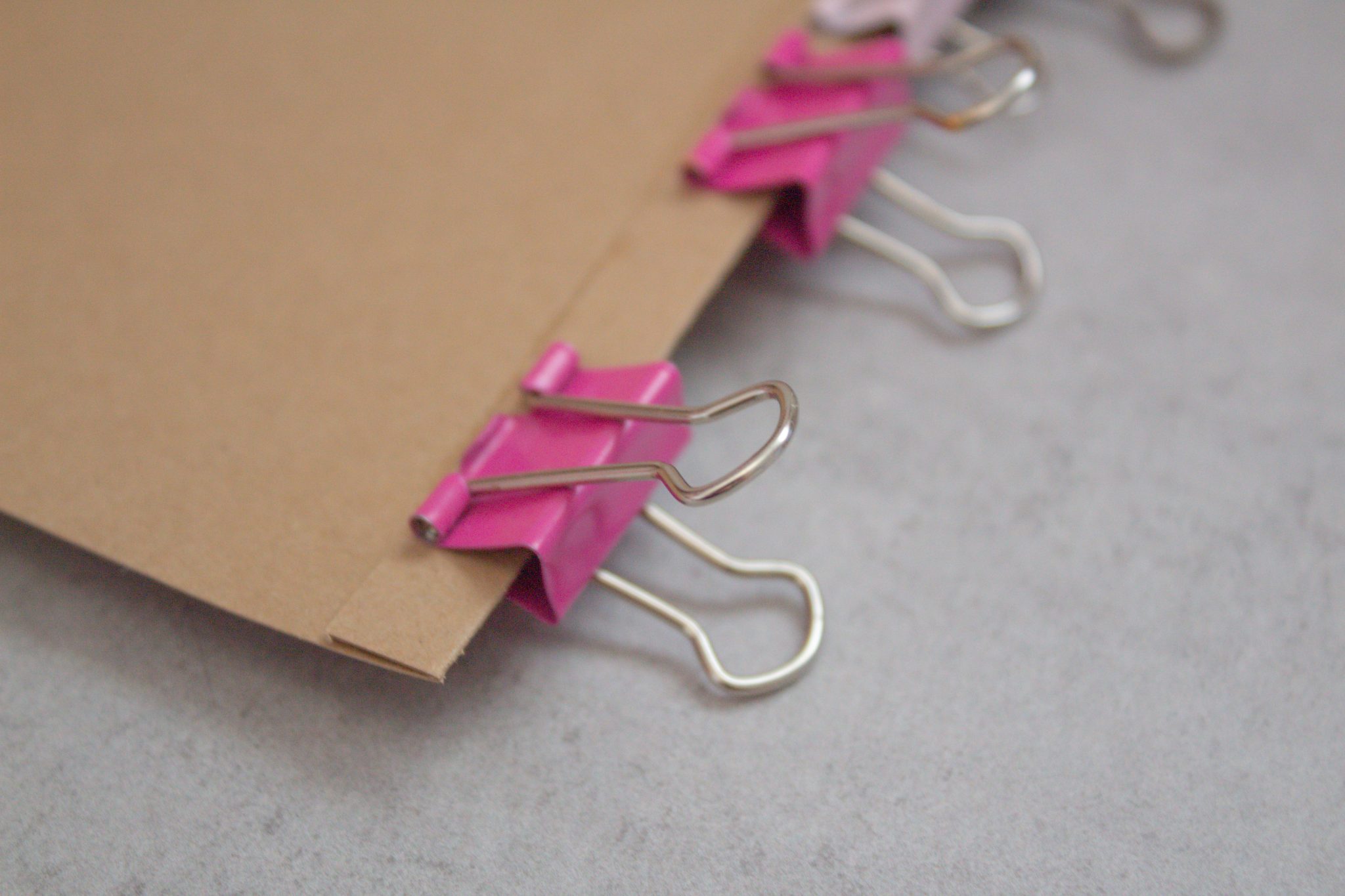 - Klebe als Nächstes die 1 cm Ränder so um, dass die geklebte Stelle innen liegt und von außen nicht sichtbar ist. Nutze die Klammern, damit der Rand gut klebt.